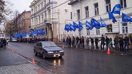 Зранку біля обласного штабу Партії регіонів на вулиці Скрипника вишикувалися три десятки молодих людей з прапорами партії.