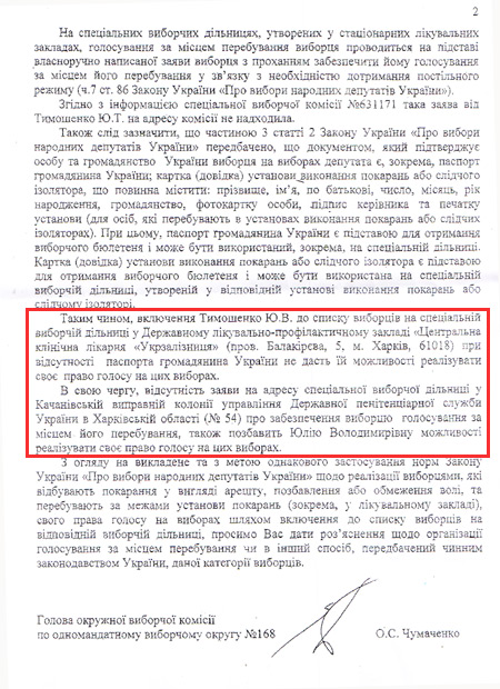Водночас "відсутність заяви на адресу спеціальної виборчої дільниці у Качанівській виправній колонії управління Державної пенітенціарної служби України в Харківській області (№54) про забезпечення виборцю голосування за місцем його перебування, також позбавить Юлію Володимирівну можливості реалізувати своє право голосу на цих виборах", - йдеться в заяві голови ОВК округу №168.