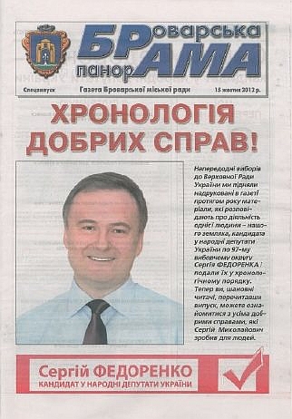 Кандидат у депутати від Партії регіонів по 97 виборчому округу Сергій Федоренко активно піариться в комунальному виданні міста Бровари.