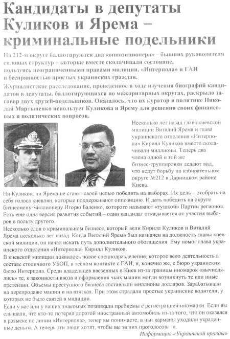 "Ні Куликов, ні Ярема не ставлять своєю метою перемогти на виборах. Їх мета - відібрати на себе голоси киян, які підтримують опозицію. І дати перемогти на окрузі бізнесменові-мільйонеру Ігору Баленко, якого називають "тушкою" Партії регіонів", - написано в ній, із посиланням на УП.