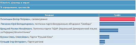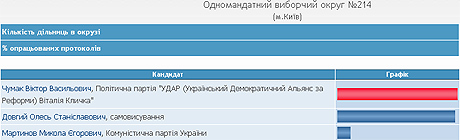 Там на першому місці представник УДАРу Віктор Чумак, якому віддал голоси за попередніми даними – 37,03%. Самовисуванець Олесь Довгий поки має 36,21% голосів.