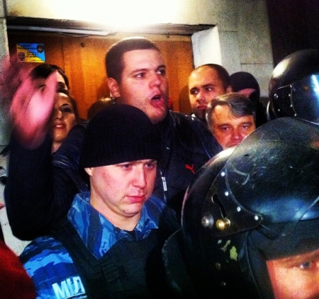 В той же час "Беркут" не пускає представників преси до приміщення комісії. При цьому керівник загону наказує всім бійцям не пропускати жодного журналіста.