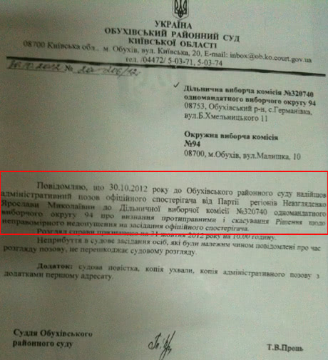 В Обухові о 10:30 розпочалися судові засідання за 17 позовами "спостерігачів" Партії регіонів та Тетяни Засухи, яким нібито не дозволили взяти участь у засіданнях дільничних комісії.