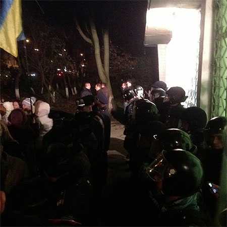 Станом на 19:00 будівля Окружкому очеплена правоохоронцями, серед яких є бійці підрозділу "Беркут" у шоломах та бронежилетах. У залі тривають суперечки.