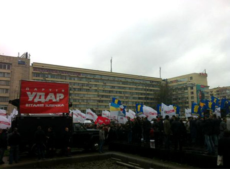 Вони тримають прапори своїх партій та скандують "Януковича геть!", "Бандита геть!", "Кримінал", а також вигукують прізвища мажоритарників, які перемогли на виборах.