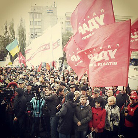 Під Центрвиборчкомом знаходиться кілька сотень людей, які тримають прапори "Батьківщини", "УДАРу" та прапори України.