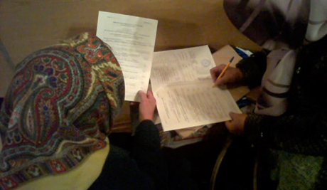 "На відео, знятому спостерігачами, видно, як члени ДВК заповнювали протоколи на колінах прямо в окружній виборчій комісії, вписуючи потрібні Партії регіонів цифри. Після цього "виправлені протоколи" акуратно складали у пакет з символікою Партії регіонів", - сказано в повідомленні.