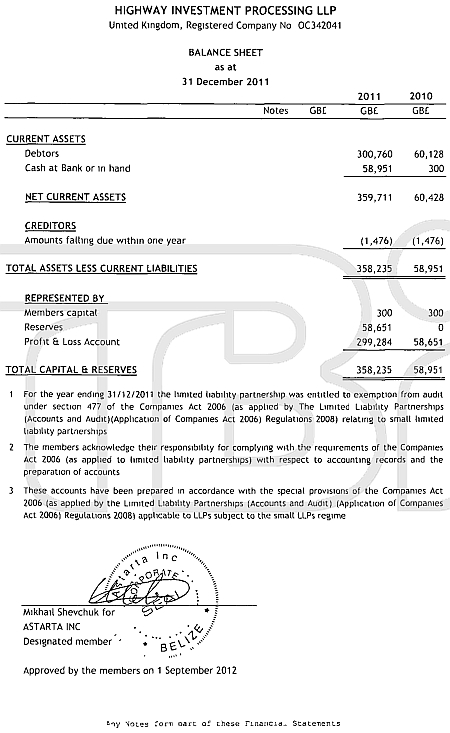 Звіт стосується фінансової діяльності за 2011 рік - саме того періоду, коли український "Чорноморнафтогаз" перерахував "Хайвей" (Highway Investment Processing) 400 мільйонів доларів за бурову вежу.