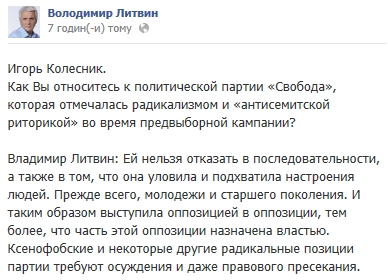Про це заявив спікер Верховної Ради Володимир Литвин на своїй сторінці в мережі Facebook, відповідаючи на запитання, як він ставиться до політичної партії "Свобода".