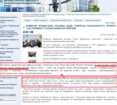 Інформація про людину, яка підписала з іспанської сторони угоду щодо LNG-терміналу, в уряді та на сайті Держагентства з інвестицій та управління нацпроектами різниться.
