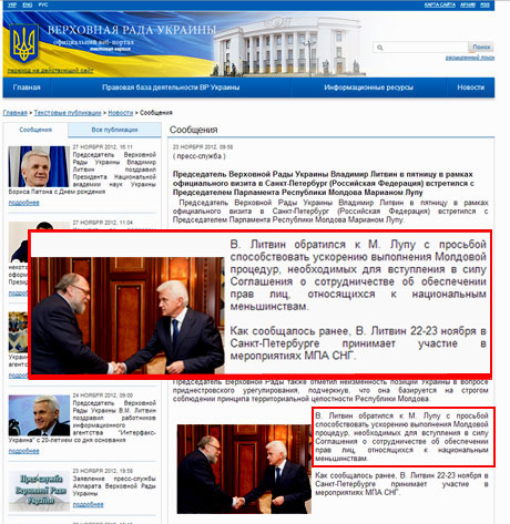 Голова молдавського парламенту зробив цю заяву, незважаючи на повідомлення на офіційному сайті Верховної Ради України про те, що дана тема піднімалася на зустрічі Литвина з Лупу під час їх візиту в Санкт-Петербург 23 листопада.