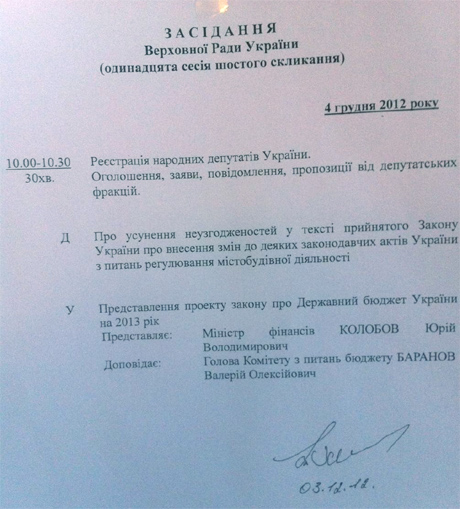 "Пропозиції, що надійдуть після 12 години 5 грудня 2012 року, Комітетом Верховної Ради України з питань бюджету не розглядаються", - сказано в проекті постанови
