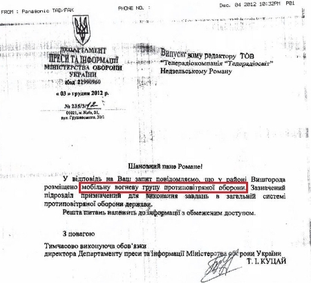 "У відповідь на ваш запит повідомляємо, що у районі Вишгорода розміщено мобільну вогневу групу протиповітряної оборони. Зазначений підрозділ призначений для виконання завдань в загальній системі протиповітряної оборони держави", - йдеться у відповіді.