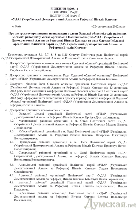 "Все керівництво одеської обласної, міської, районних і первинних організацій партії "УДАР" звільняється від своїх обов'язків без зазначення причин. Призначено в.о. на ці посади вольовим рішенням партії. Єдине, що ми знаємо точно це те, що до 22 листопада 2012 року практично всі ці люди членами партії "УДАР" не були, заяв про вступ до партії в одеську обласну організацію партії не подавали і ніякого відношення до партії не мали", - стверджує він.