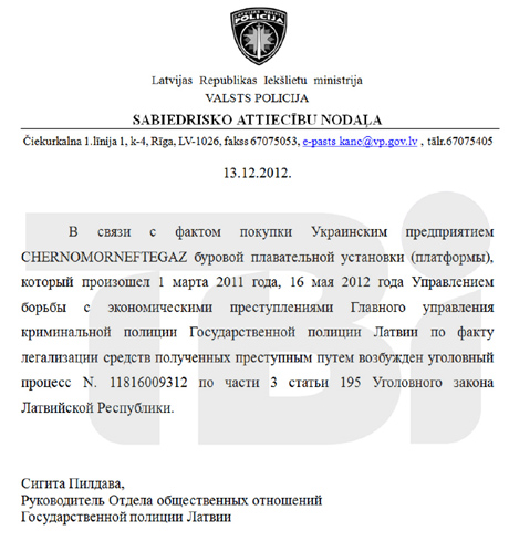 "У зв’язку з фактом покупки українським підприємством CHERNOMORNEFTEGAZ бурової плавучої установки (платформи), який відбувся 1 березня 2011 року, 16 травня 2012 року Управління боротьби з економічними злочинами Головуправління кримінальної поліції Головної поліції Латвії за фактом легалізації засобів, отриманих злочинним шляхом, порушено кримінальний процес N. 11816009312 за частиною 3 статті 195 Кримінального закону Латвійської республіки", – йдеться у відповіді.