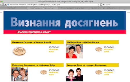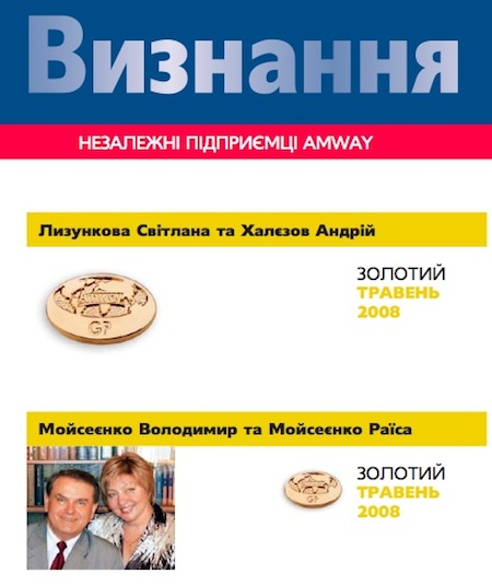 Подружжя Раїса і Володимир Моїсеєнко в якості "незалежних підпріємців Amway" відзначені в рубриці "Визнання досягнення".