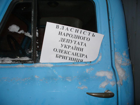"Як мені розповіли активісти, в автомобілі зламали дверцята і спробували завести двигун. Після невдалих спроб зрушити автомобіль з місця, зламники підчепили вантажівку іншим автомобілем-КамАЗом – із номером АІ 08 84АА і відсунули моє авто, розблокувавши вхід", - зазначив Бригинець.