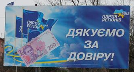 Якщо збільшити зображення борду, то помітно, що на існуючу фактуру з подякую за довіру від імені Партії регіонів наліплена велика 200-гривнева купюра.