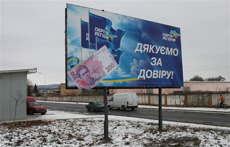 В Ужгороді невідомі наліпили на бігборди із подякою за довіру від Партії регіонів зображення 200-гривневої купюри.