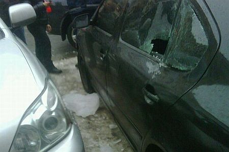 | Бурулька впала з даху "Арена-сіті" на Бессарабській площі і пробила вікно автомобіля. Фото: Українська правда |
