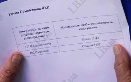 Так, на фото видно, що депутат Юрій Самойленко зобов'язаний проконтролювати, щоб Володимир Мисик (278) і Володимир Олійник (403) проголосували за Дениса Омеляновича (277) і Ірину Бережну (402).