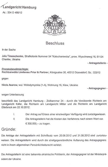 "Рішенням у справі №324 О 486/12 судді - голова Земельного суду Кефер, судді Мітлер та Еленброк - відхилили позов Юлії Тимошенко до Миколи Азарова", - сказано в повідомленні Кабміну.