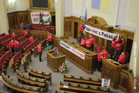 На трибуні розміщено плакати "Рада гниє з Рибака" і "Кнопкодави – геть із Ради".