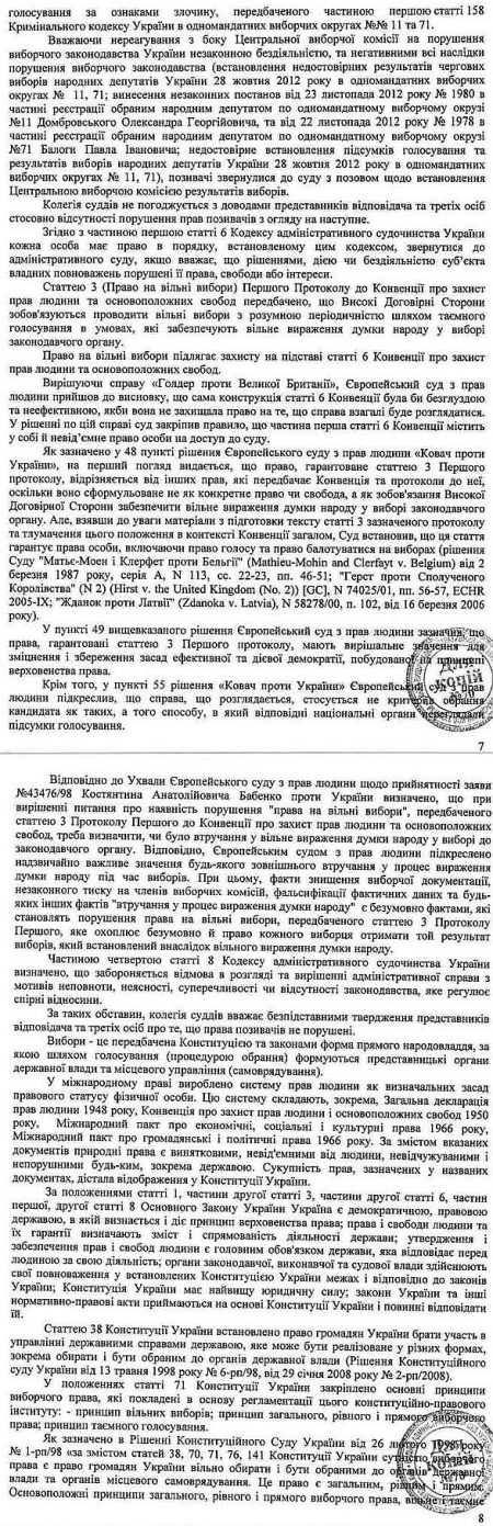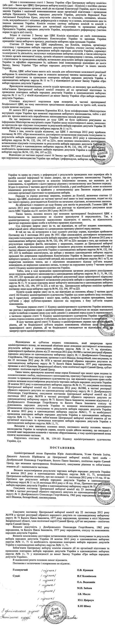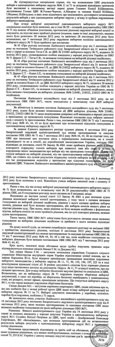 Разом з тим, судді обґрунтовують необхідність проведення повторних виборів у 11-му і 71-му окрузі, посилаючись на рішення Верховного суду про проведення третього туру президентських виборів 2004 року - на думку суддів ВАСУ, подібне рішення, прийняте в 2004 році, коли права виборців були порушені, отримало схвалення міжнародного суспільства.