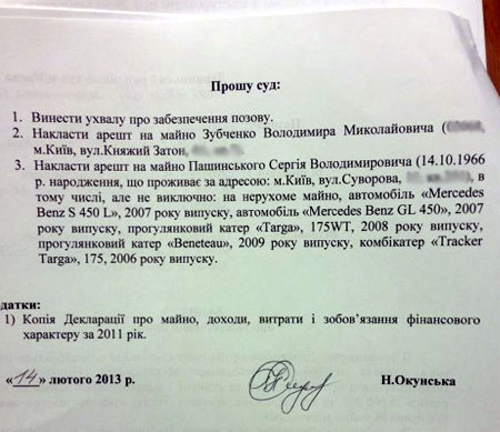 Як сказано у позові Окунської, Пашинський володіє двома автомобілями Mercedes і трьома катерами.
