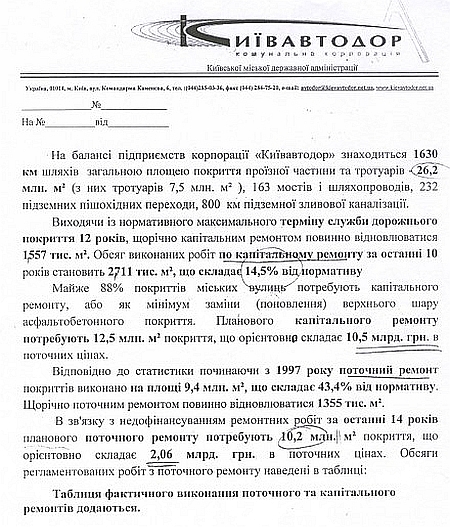 Окрім того, Давиденко зазначив, що за даними "Київавтодору", "щорічно капітальним ремонтом повинно відновлюватися 1557 тисяч метрів квадратних шляхів, а поточним – 1355 тисяч метрів квадратних".