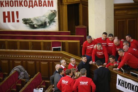 Представники партії УДАР у червоних светрах із написом "Голосуємо особисто" перебувають у президії парламенту і біля неї.