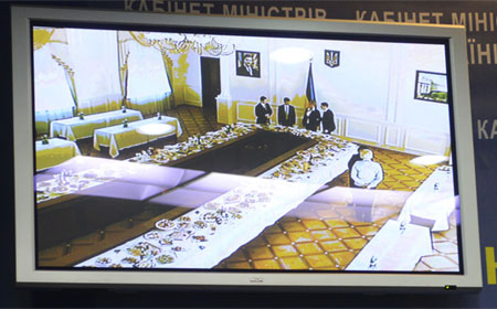 Спочатку деякий час на моніторах було зображення без звуку, а потім на екрані з’явилося зображення великого залу Кабміну з довгим бенкетним столом.