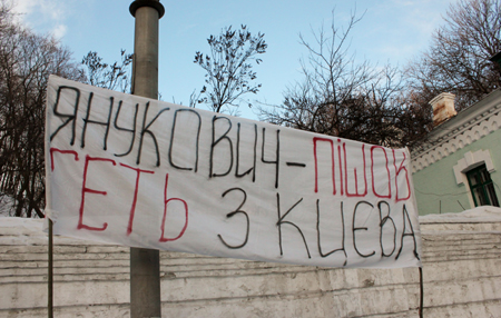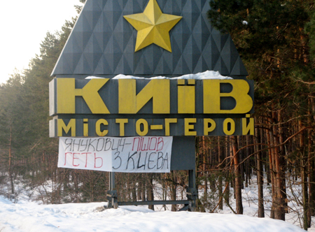 У середу дорогу Віктора Януковича з Межигір’я на роботу прикрасили транспарантами "Янукович, пішов геть з Києва!".