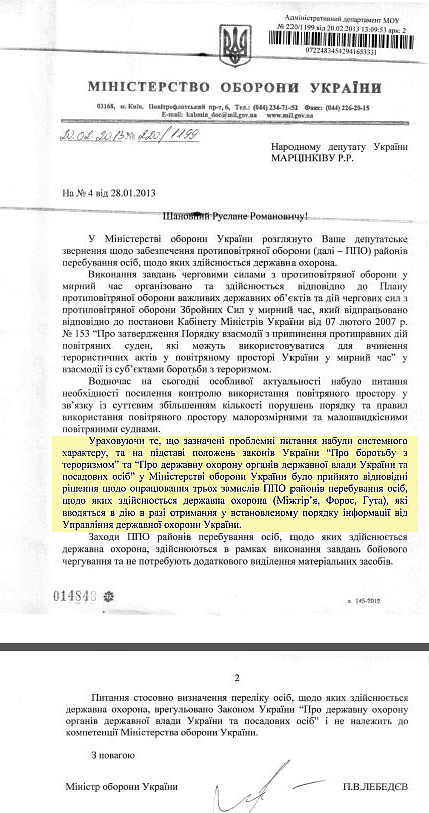 На запит депутата від "Свободи" Руслана Марцінківа міністр оборони Павло Лебедєв відповів так: "на сьогодні особливої актуальності набуло питання необхідності посилення контролю використання повітряного простору у зв'язку з суттєвим збільшенням кількості порушень порядку та правил використання повітряного простору малорозмірними та мало швидкісними повітряними суднами.".