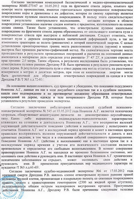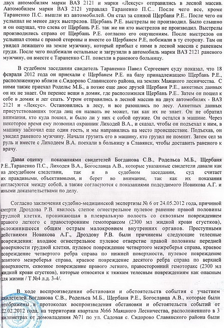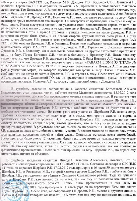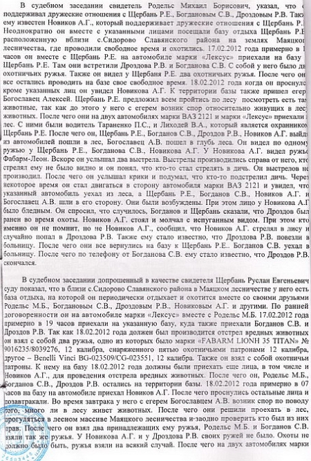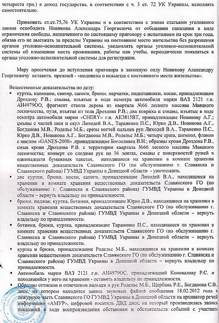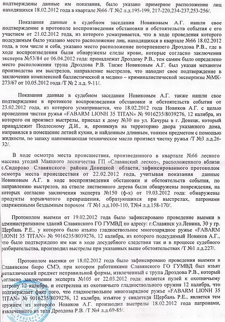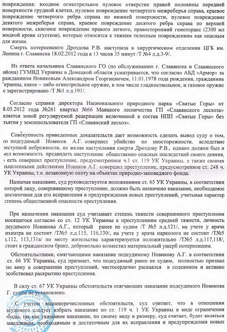 Депутат оприлюднив для ознайомлення громадськості вирок Слов’янського міськрайонного суду Донецької області в справі про вбивство 18 лютого 2012 року на полюванні в заповіднику біля села Сидорово Слов’янського району місцевого мешканця Р.Дроздова.