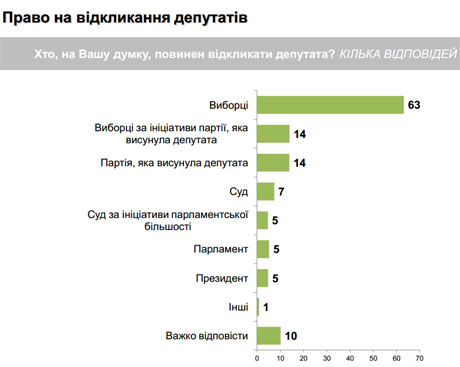 Крім того, 5% опитаних вважають, що відкликати депутата повинен лише парламент, а ще 5% – президент. Не визначились з цього питання 10%.