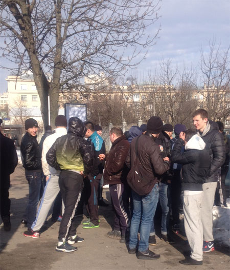 Близько 50 молодих хлопців зібралися біля метро Арсенальна і двома колонами підійшли до паркану Верховної Ради.