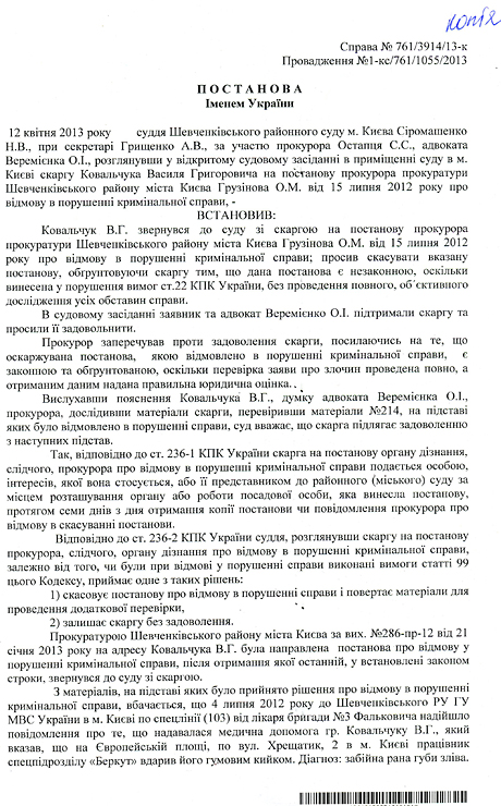 Шевченківський райсуд Києва задовольнив позов Василя Ковальчука щодо його побиття співробітниками "Беркута" під час акцій протесту під Українським домом минулого року.