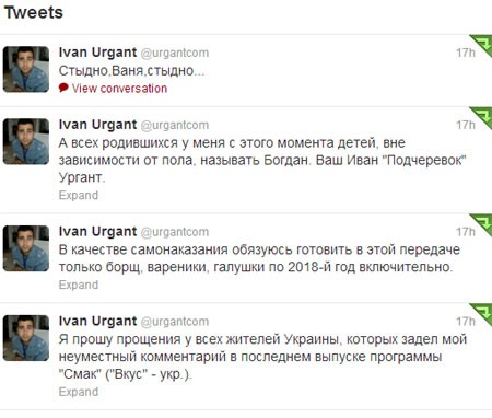 "В якості самопокарання зобов'язуюсь готувати в цій передачі тільки борщ, вареники, галушки по 2018-й рік включно А всіх народжених у мене з цього моменту дітей, незалежно від статі, називати Богдан. Ваш Іван "Підчеревина" Ургант", - пожартував він.