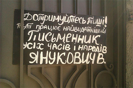 КУПРівці також прикріпили до огорожі Банкової табличку зі словами: "Дотримуйтесь тиші! Тут працює найвидатніший письменник всіх часів і народів Янукович".