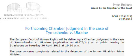 "Європейський суд з прав людини оголосить рішення у справі Тимошенко проти України (скарга №. 49872/11) на публічних слуханнях у Страсбурзі у вівторок 30 квітня 2013 о 10:30 ранку (за місцевим часом)", - сказано в повідомленні.