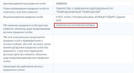 Керівником юридичної особи телеканалу ТВі ТОВ "Телерадіосвіт" зареєстрована Наталія Катеринчук.