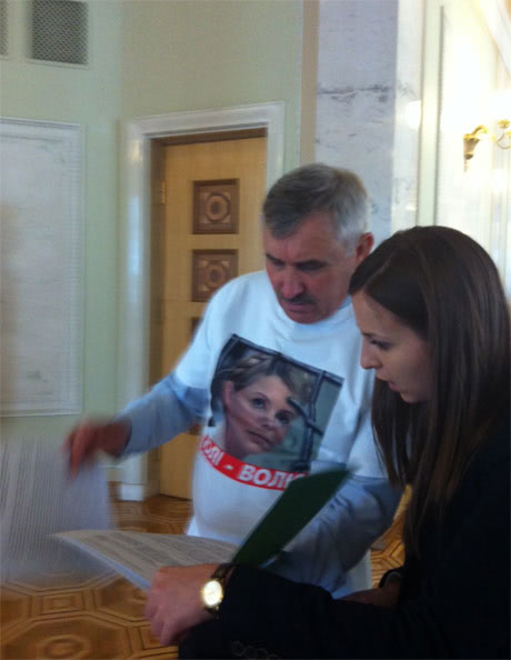 У свою чергу депутати від Батьківщини одягли футболки "Юлі-волю!". Бютівець Сергій Сас пояснив це так:" У нас сьогодні свято, ми чекаємо президента".