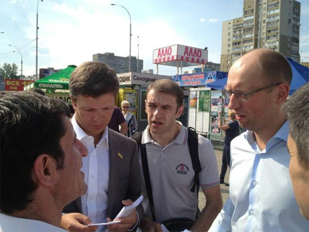 На "кругу" метро "Героів Дніпра" агітки з Арсенієм Яценюком також роздавали київські мажоритарники Леонід Ємець, Віталій Ярема та громадські активісти.