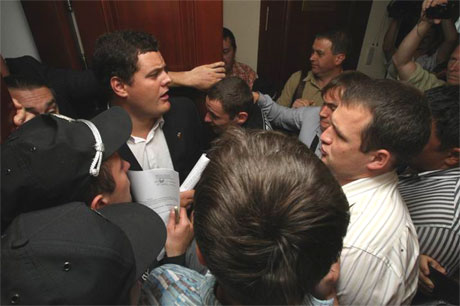 Депутати Верховної Ради з фракції ВО "Свобода" Ігор Мірошниченко, Андрій Іллєнко та їхні помічники виламали двері до зали засідань Київської міської ради, бо їх туди не пускали.