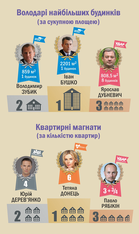 "Справжнім "квартирним магнатом" можна вважати "ударівця" Ярослава Дубневича – разом з членами сім’ї він володіє 18 квартирами", - зазначають у "Чесно". Окрім того Дубневич має найбільшу кількість будинків - 8 - сукупною площею 808,5 кв.м.