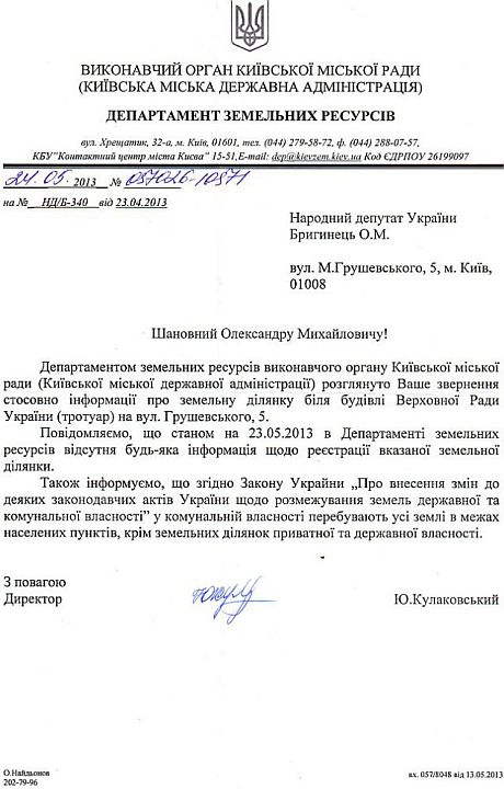 "Саме тому, я оприлюднюю оригінал відповіді Департаменту земельних ресурсів на моє звернення, щоб кожен бажаючий, якого міліція не пропускає на навколишню територію ВРУ, міг надати паперовий доказ того, що ви маєте право ходити по землі, яку влада намагається у вас "вкрасти", - заявив Бригинець.