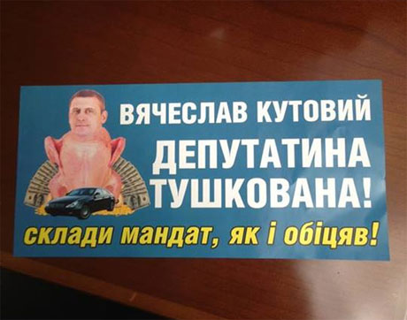 У Верховній Раді поширили листівки , на яких зображений депутат-тушка В'ячеслав Кутовий, обраний до Верховної Ради по 95 округу.
