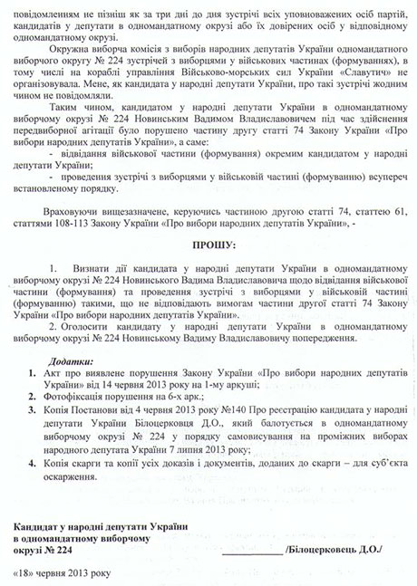 Як відомо, раніше Білоцерковець подав скаргу і просив визнати дії кандидата у депутати Новинського такими, що не відповідають вимогам закону про вибори депутатів.