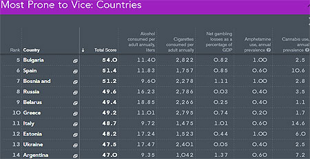 Країни в рейтингу розташовані за їх схильністю до таких пороків як алкоголь, сигарети, наркотики і азартні ігри.